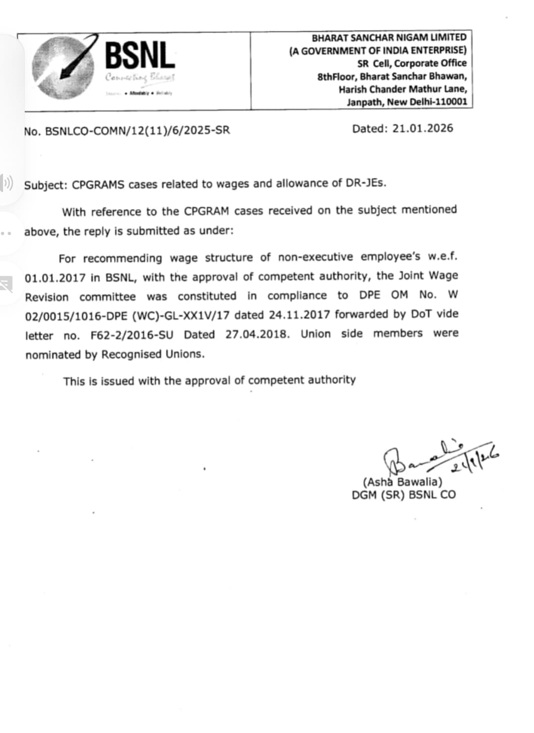 3rd PRC implementation:The scheduled meeting between Smt Aruna Sundarrajan, Secretary/DoT and BSNL Management was held at 4 PM today, 23.06.2017. DIR(HR), CGM(Legal), PGM(Estt) and GM(SR) represented BSNL.